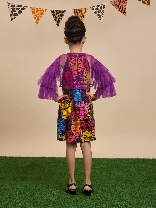 Leopard Girls Multi Color Stylish Dress with Purple Shrug and Hairband