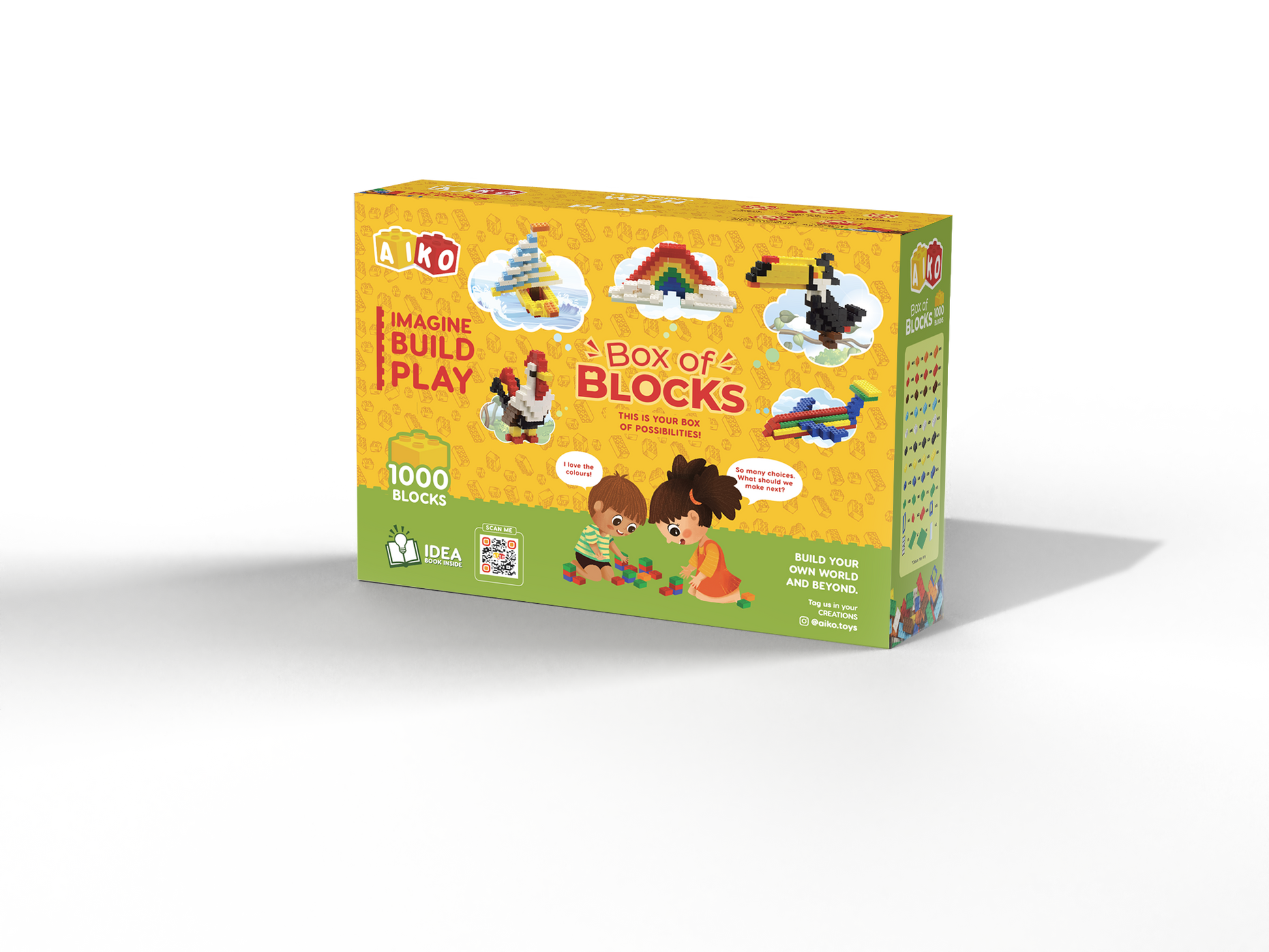 The third set in Box of Blocks range, it has 1000 building blocks, and an easy-to-understand Idea Booklet to get young boys and girls started – it is an ideal construction toy choice for children above 4years of age, as it encourages free play. With this set, the child can be creative and use their imagination to express themselves with their creations. This AIKO set is a great addition to all the other blocks the child may have, as it includes a base plate and piece remover. This is the biggest set of the series.