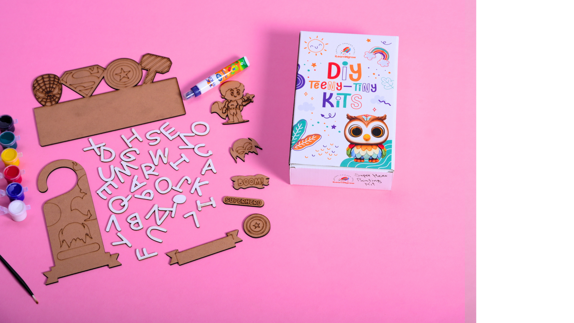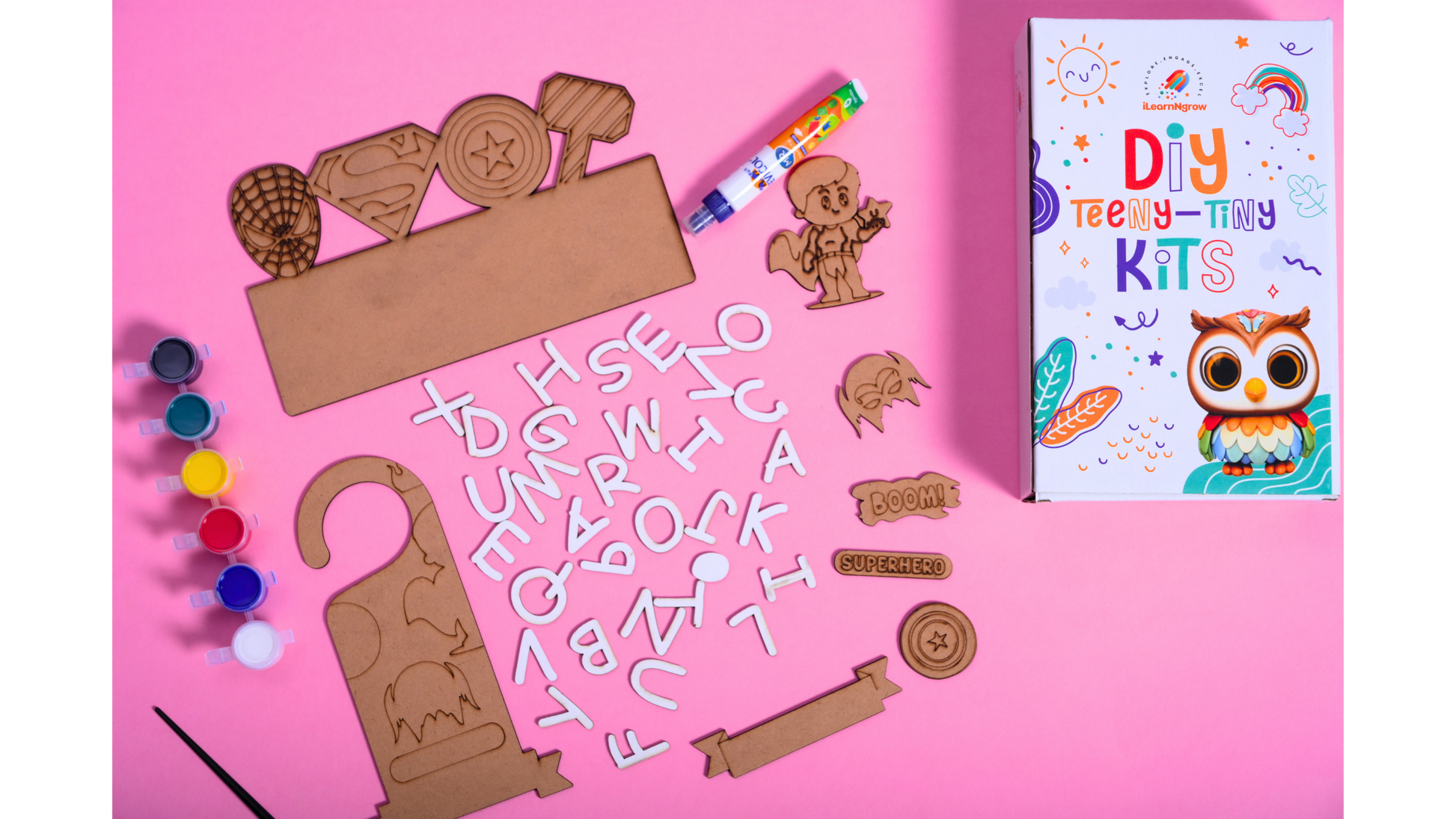 The iLearnNGrow Teeny Tiny Superhero Theme Name Plate and Door Knob Kit is the ultimate creative activity for little superheroes-in-training. This engaging DIY set features a superhero-themed name plate and door knob hanger, perfect for decorating with a burst of color and imagination.
